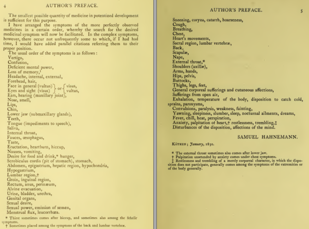 The list of symptoms follows the following order (quoted from the introduction to Hahnemann’s Materia Medica Pura, p4-5):